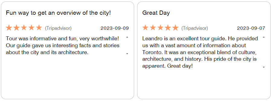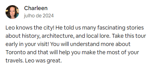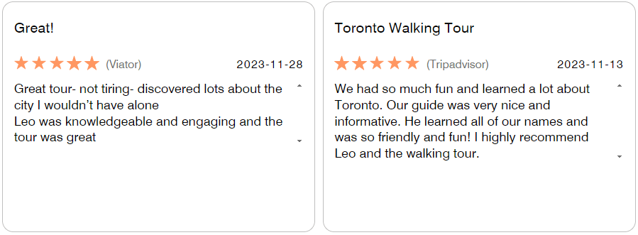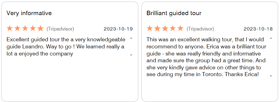 Maple Leaf Tours began as an Airbnb Experience in 2018 founded by a group of friends from Canada, Australia, and Brazil. They wanted to show their favorite bars, restaurants, and neighborhoods to the travelers of the hostel that they all worked together. Since then our walking tour has expanded into a more comprehensive tour of Toronto’s history and culture, with more than 1,000 5-star reviews on Viator, TripAdvisor, and AirBnB.